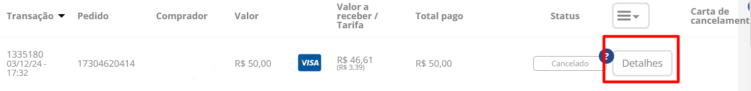 Para consultar o motivo do cancelamento é importante clicar em "Detalhes" ao lado do pedido: