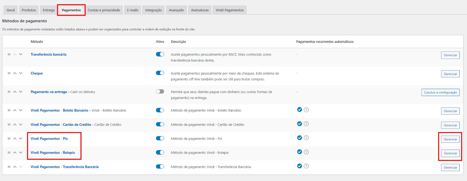 Em seguida, na aba superior clique em "Pagamentos" e em seguida identifique os métodos de pagamento da Vindi (Pix ou Bolepix) e clique em "Gerenciar".