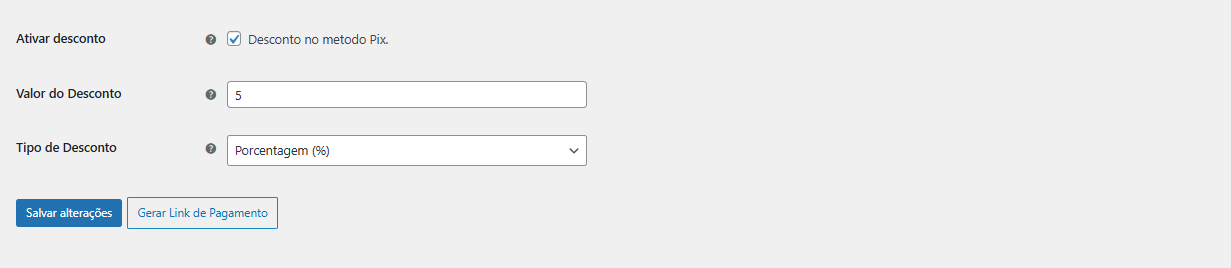 Agora é necessário ativar a funcionalidade marcando a opção "Ativar desconto" e configurar o valor em porcentagem no campo "Valor de Desconto". O campo tipo de desconto é padrão. Após isso clique no botão "Salvar Alterações".