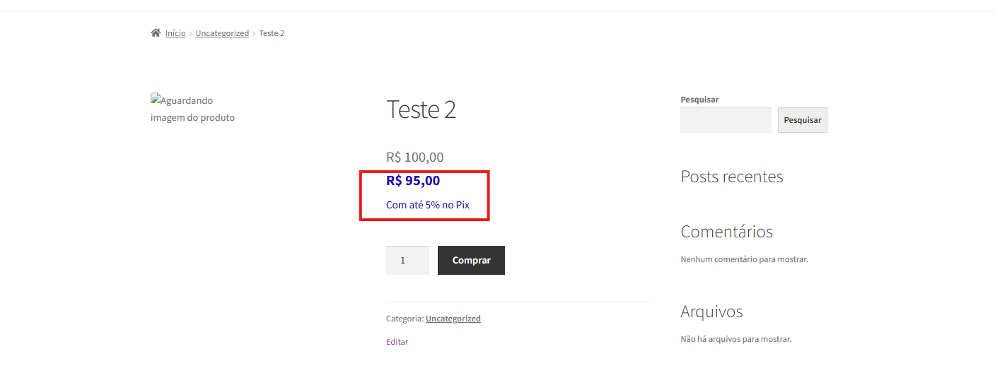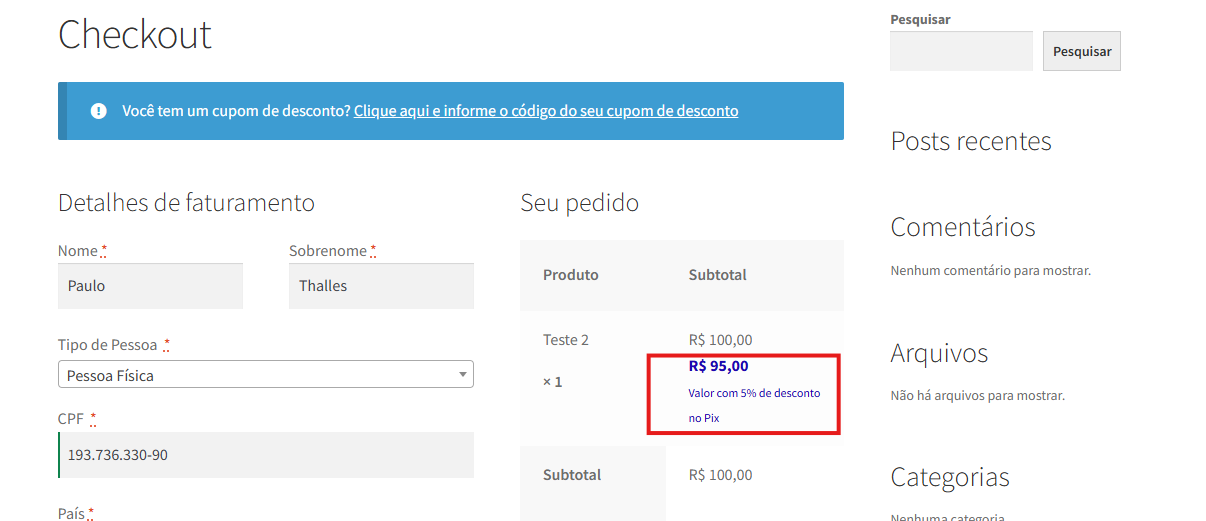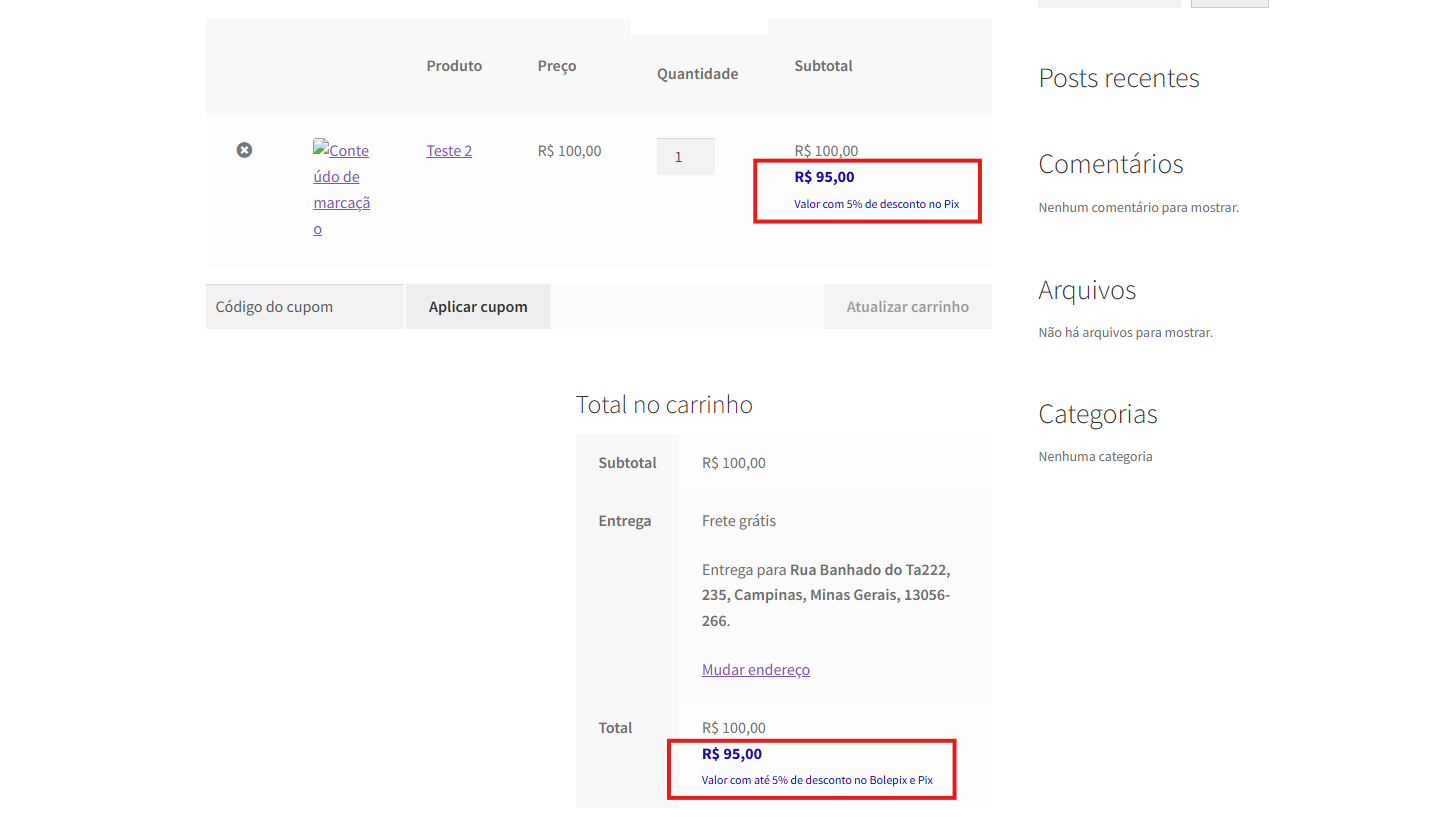Exemplo do desconto destacado no checkout e na seleção do método de pagamento: