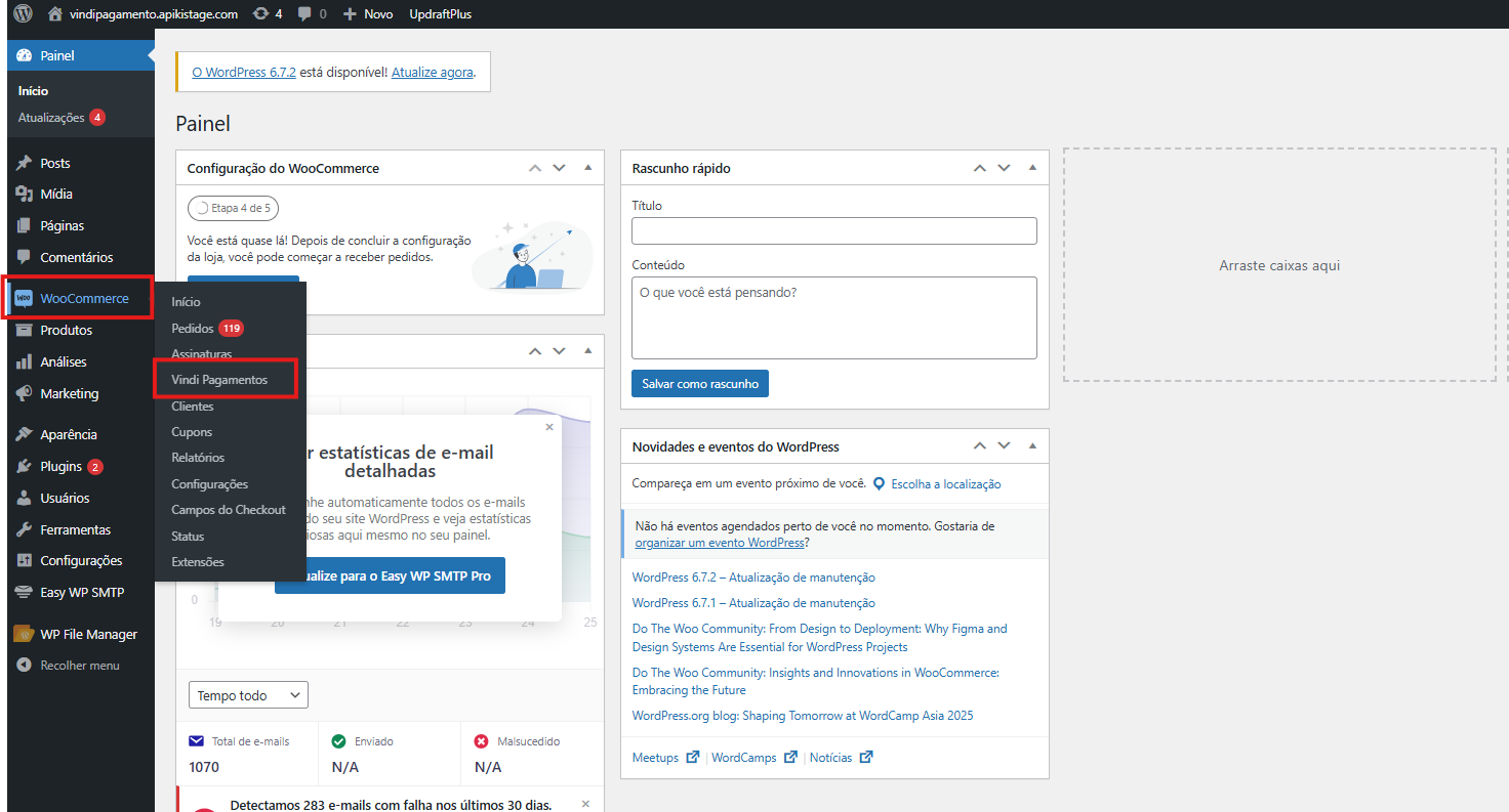 Acesse o painel da sua loja Woocommerce em: menu Woocommerce > Vindi Pagamentos.