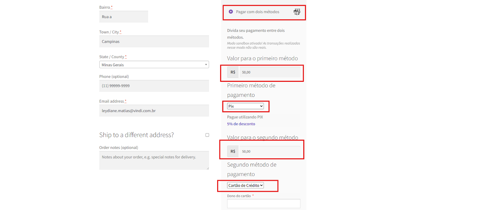 Como realizar a configuração de pagamento com dois métodos de pagamento?