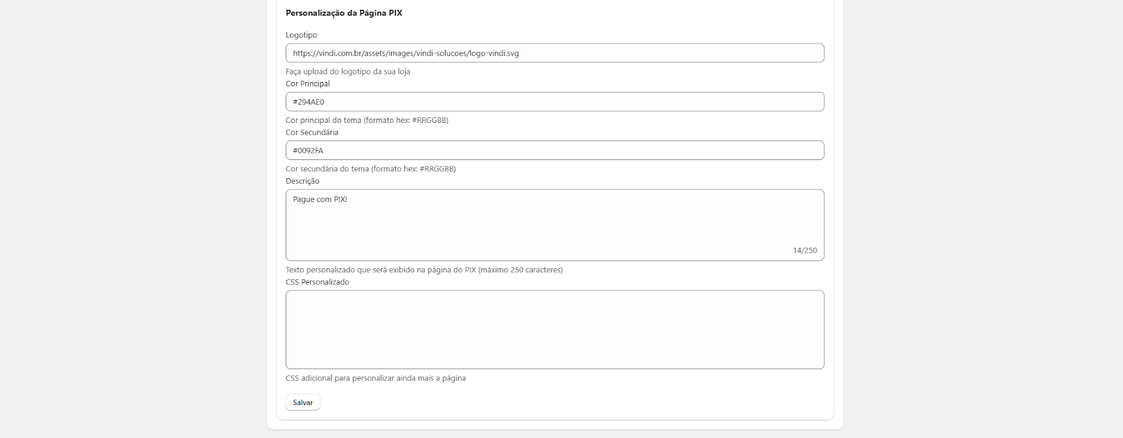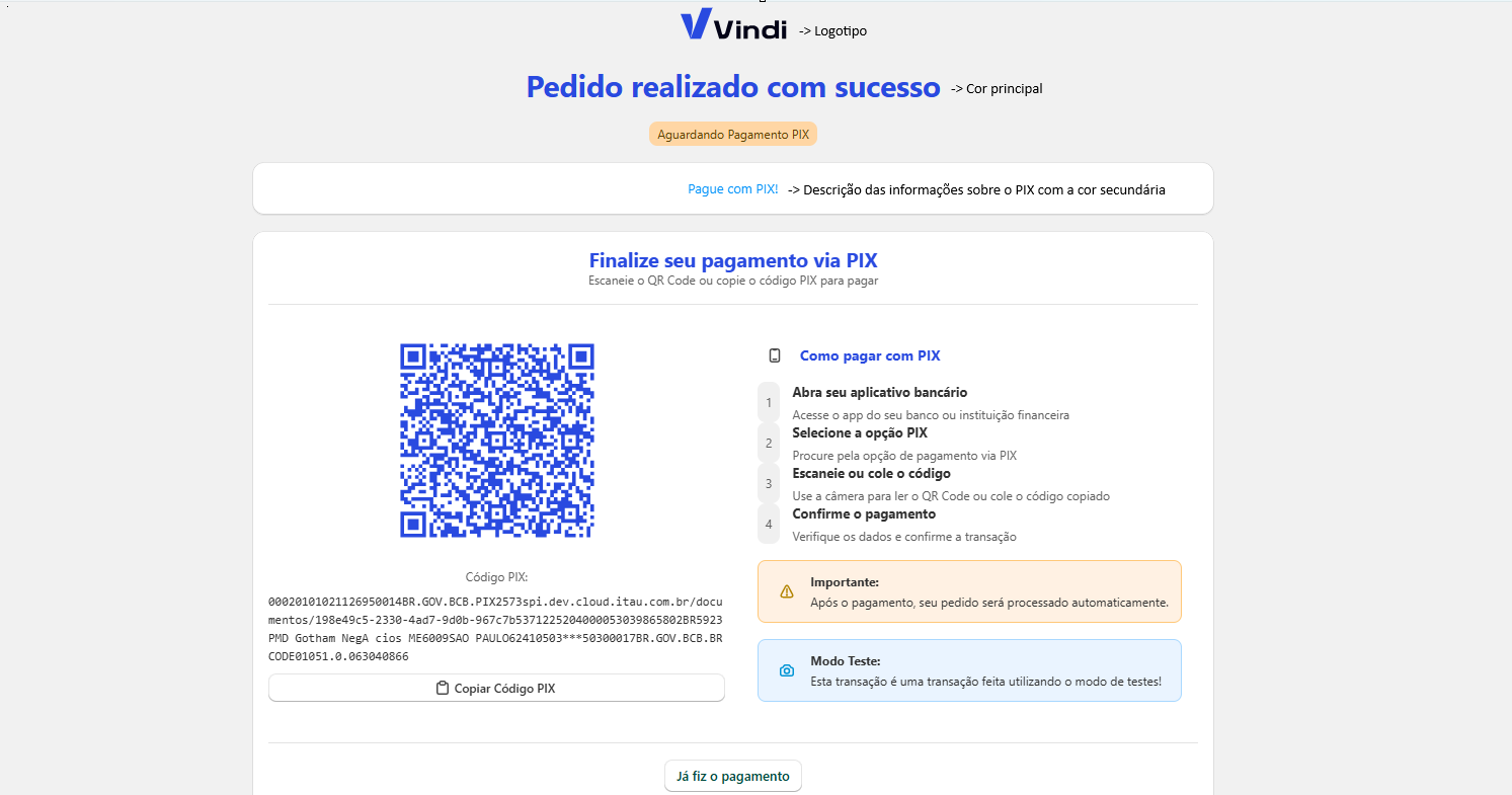 Para uma melhor identidade visual alinhada com a do lojista, hoje permitimos que lojistas customizem a página de pagamento via Pix no checkout da Vindi no Shopify. Com isso é possível realizar a personalização do logo e a inclusão de texto, fidelizando a identidade do cliente e oferecendo uma experiência de pagamento personalizada.